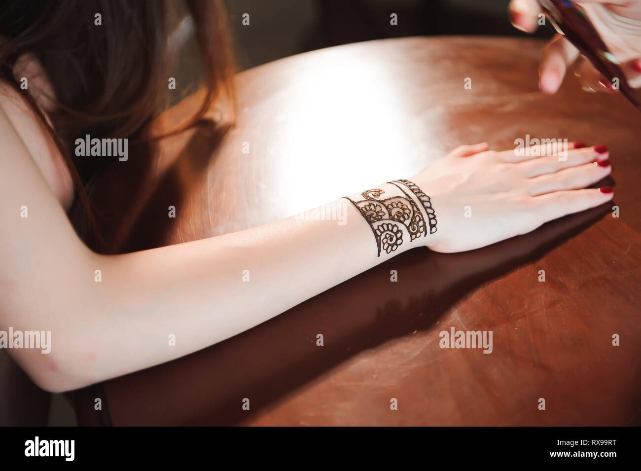 Artist Applying Henna Tattoo On Women Hand Stock Photo