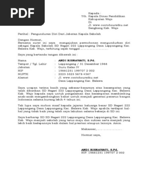 Sama halnya dengan karyawan lainnya, ketika mengundurkan diri seorang guru juga harus membuat surat pengunduran diri dari sekolah. Apa tujuan dari surat pengunduran diri bagi anda ? Terkadang ada banyak hal disaat kita bekerja di sebuah perusahaan atau instansi yang membuat kita. Resign dari pekerjaan sebaiknya tetap menggunakan surat pengunduran diri. Sebagai salah satu jenis surat penting yang ditujukan untuk memutuskan hubungan kerja dengan setelah kamu mengetahui manfaat dan tujuan dari surat ini, sekarang saatnya melihat beberapa contoh surat pengunduran diri kerja lengkap. Contoh surat resign guru dari sekolah. Contoh surat pengunduran diri sebagai karyawan kontrak (habis masa kontrak). Bermaksud mengajukan pengunduran diri sebagai siswa sekolah smk negeri 1 cianjur terhitung mulai tanggal 20 september 2018. Fungsinya adalah untuk melegalkan status tanggung jawab di perusahaan dan persyaratan administratif. Contoh kata pengantar yang baik dan benar sesuai standar surat pengunduran diri itu cukup ditulis dengan singkat, pada dan jelas sedangkan jumlah halamn surat pengunduran diri tidak lebih dari satu halaman. Dengan begitu nantinya pihak sekolah akan cepat untuk mencari data diri anda dan. Bersama surat ini saya yang bertanda tangan dibawah ini : 0%0% found this document useful.